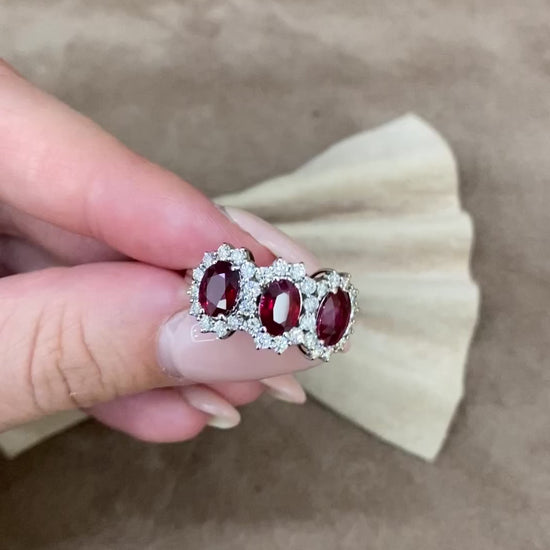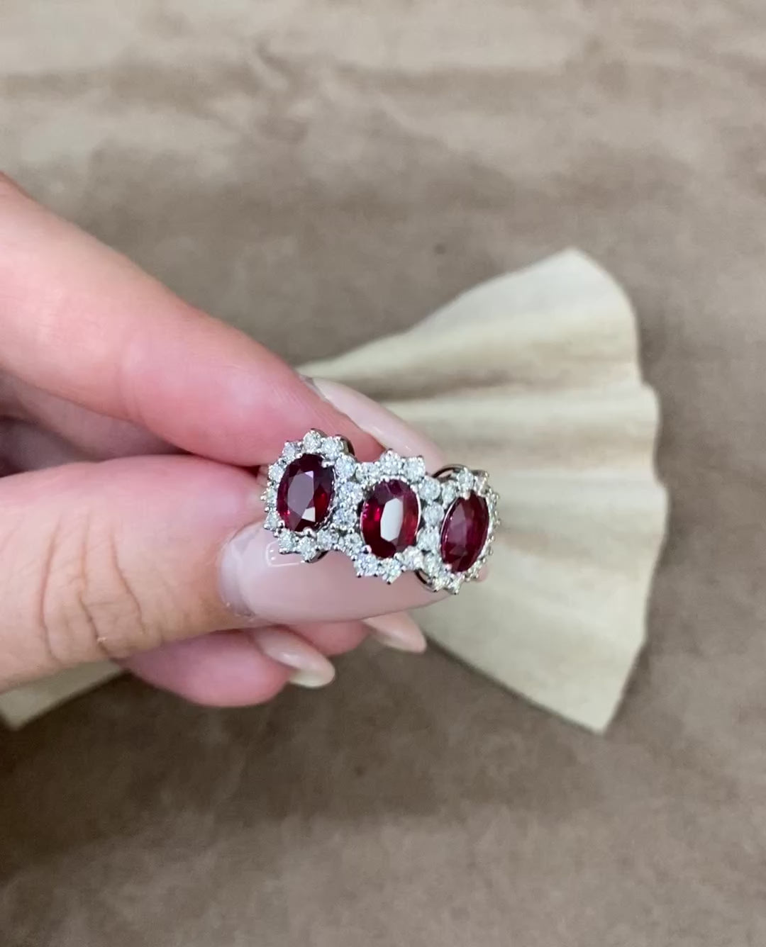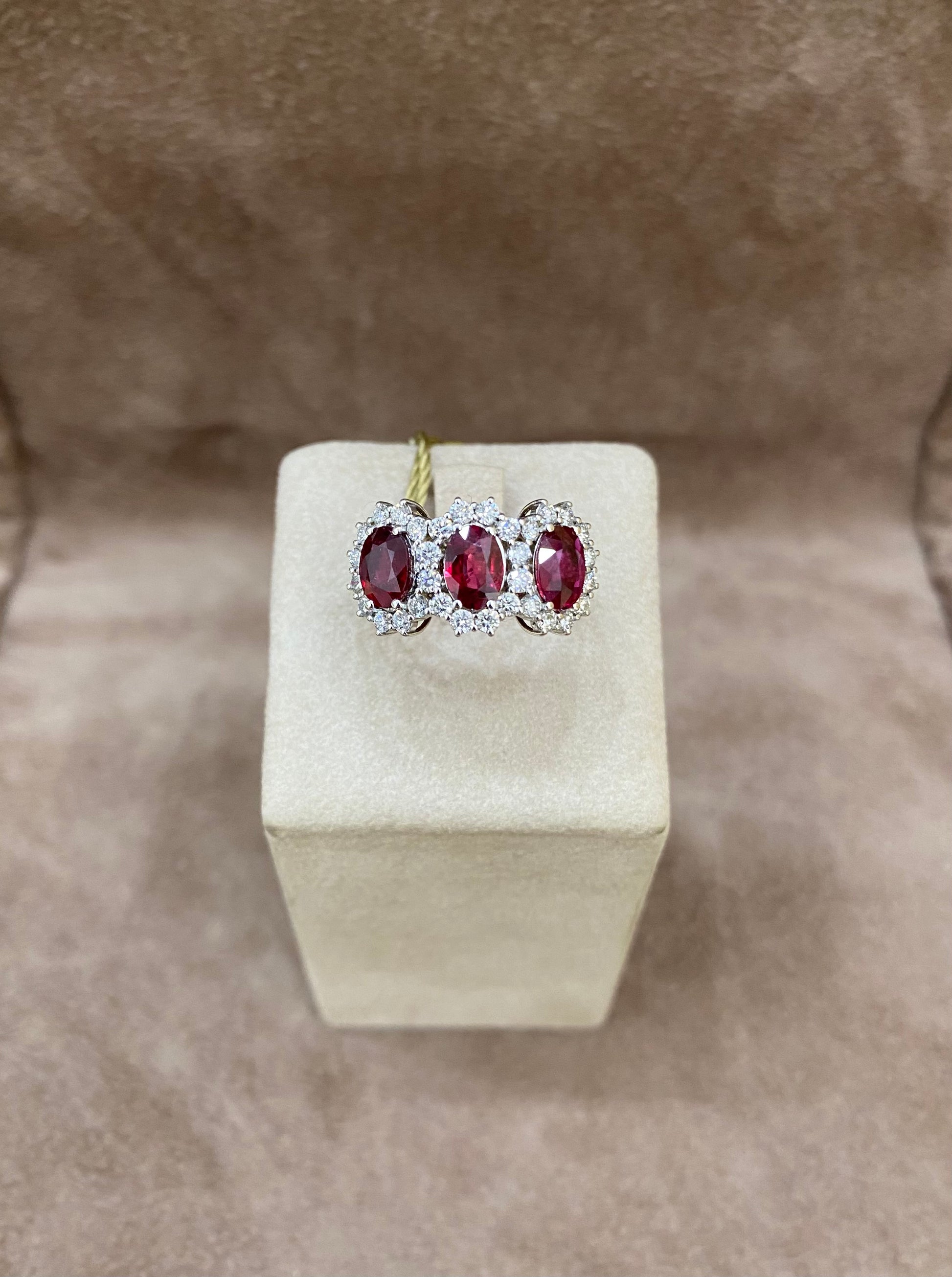 Anello trilogy in oro bianco 18Kt e rubini naturali per un totale di 2,57ct, contornati da 0,90ct di diamanti naturali.